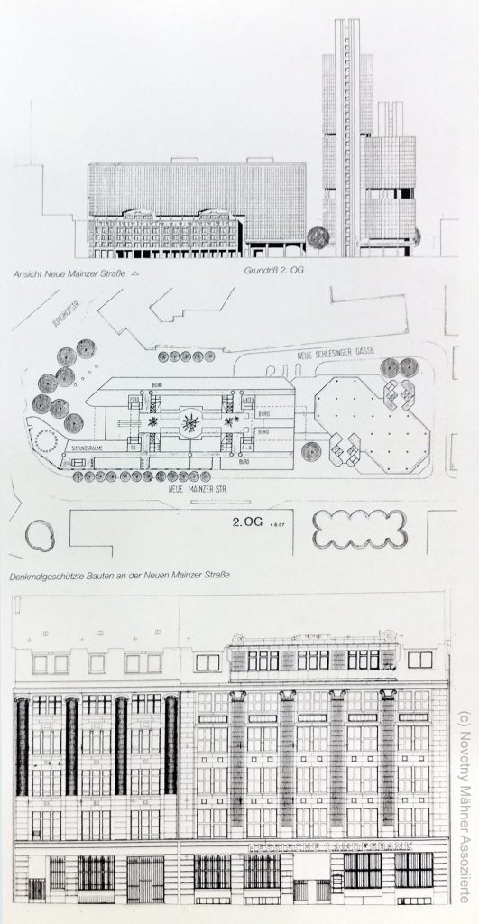 Die Aufgabe des gutachterlichen Entwurfs war es daher insbesondere, „die Übergänge zu dem Nachbargebäude in architektonischer und künstlerischer Hinsicht harmonisch zu lösen und Nachteile für die Nachbarbebauung zu vermeiden“. Der gründerzeitliche Sockel sollte in den Neubau integriert werden und eine Brücke zum benachbarten Helaba-Hochhaus schlagen. Dieser Helaba-Turm entstand zwischen 1973 und 1976 und wurde ebenfalls von Novotny Mähner Assoziierte entworfen.