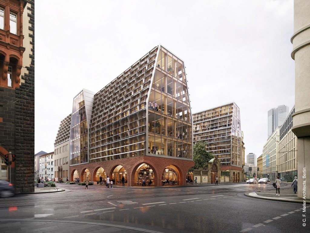Torsten Becker: Die Architektursprache des Baukörpers empfinde ich für diesen Ort als fremd. Er ist seltsam monolithisch, was überhaupt nicht zur Feingliedrigkeit vieler Gebäude in der Frankfurter Altstadt passt. Aber auch die anderen Entwürfe aus dem Wettbewerb sind dahingehend nicht überzeugend. Mit dem vorgeschlagenen Konzept würde wieder ein Stück Geschichte aus der westlichen Altstadt verschwinden. Dabei gibt es dort mit den Bauten am ehemaligen Bundesrechnungshof und dem Degussa-Areal schon zu viele Gebäude, die architektonisch beliebig wirken und städtebaulich zu großmaßstäblich sind.