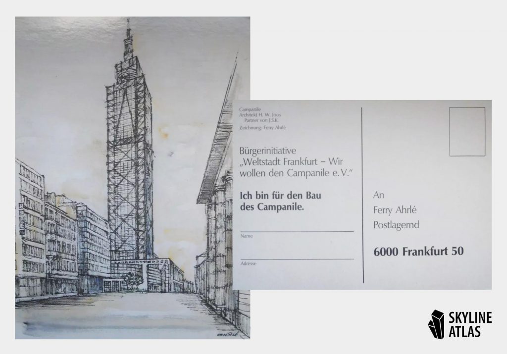 Den ersten Entwurf, der auch Bahntower genannt wurde, leistete der Architekt Hans Robert Hiegel mit einer Gesamthöhe von 180 Metern im Auftrag der Stadt Frankfurt. Ein weiterer Entwurf für den Campanile, der in den Medien größere Beachtung fand, wurde vom Frankfurter Büro JSK Architekten vorgestellt. Darauf folgten höhere Varianten für das Campanile-Hochhaus sowohl von Hiegel als auch JSK Architekten. Einige Jahre später wurde in einem Wettbewerbsverfahren der Entwurf von Oswald Mathias Ungers mit dem ersten Preis prämiert. Ein Geschäftsführer von JSK war hierbei im Preisgericht vertreten.