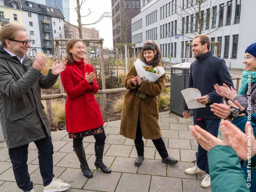 Frankfurt am Main hat beim bundesweiten Wettbewerb „Abpflastern“, der von März bis Oktober 2025 lief, den ersten Platz belegt und ist damit „deutscher Meister im Entsiegeln“. Den symbolischen Preis – einen Blumenstrauß als Vorboten einer „ewigen Blume“ aus Metall – nahmen am 18. Dezember Klima- und Umweltdezernentin Tina Zapf-Rodríguez und Mobilitätsdezernent Wolfgang Siefert gemeinsam mit Vertreter:innen des Klimaentscheids Frankfurt entgegen.