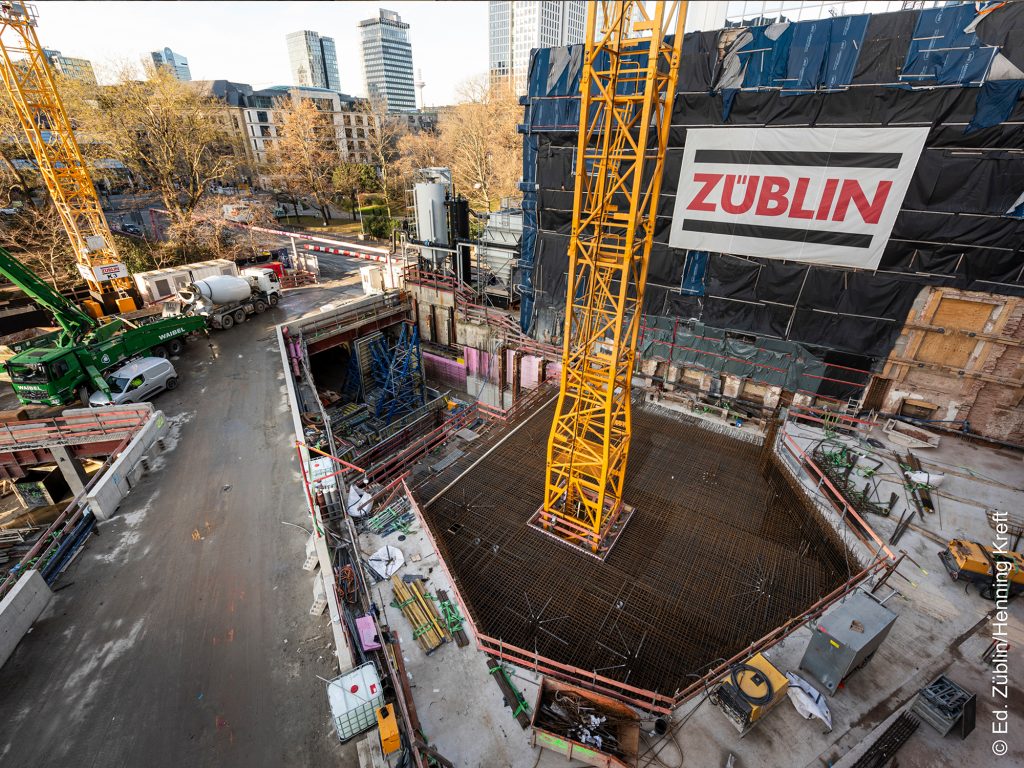Mit dem Central Business Tower entsteht in unmittelbarer Nähe des FOUR Frankfurt und des Omniturm einer der höchsten Wolkenkratzer der Stadt. Mit seinen 205 Metern wird es nach Fertigstellung das fünfthöchste Hochhaus sein. Nach aktuellem Stand Anfang 2025 sind die Aushubarbeiten für die Deckelbauweise abgeschlossen. Hierbei wurden beinahe 91.500 Kubikmeter Erdhaushub vorgenommen, was circa 7.400 LKW-Ladungen entspricht. Ferner ist die Herstellung der Bodenplatte beendet. Die Großbetonage fand dabei vom 31.11.- 01.12.2024 statt. Hierbei wurden 78 Stunden Betonage mit 10.220 Quadratmetern Beton benötigt. Zur Zeit werden die Zwischendecken, Innenwände und der Hochhauskern in den Untergeschossen hergestellt. Bis Mai 2025 soll sodann die Erdgleiche erreicht sein, womit das Hochhaus bereits ab spätestens Juni dieses Jahres im Wochentakt wachsen wird. Daneben haben die Rohbauarbeiten in den Obergeschossen des Sockelbaus begonnen.