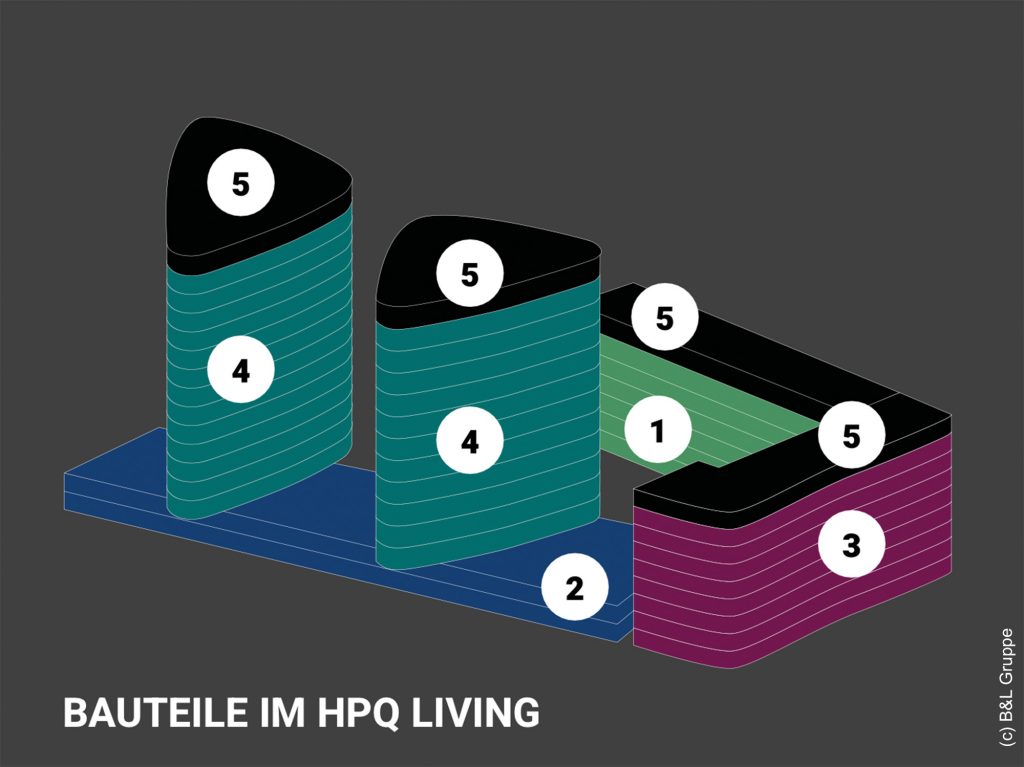 Die beiden Wohntürme des HPQ Living erhalten eine hochwertige Aluminium-Fassade mit eingebauten Loggien für die Wohnungen. Das Sockelgebäude wird dagegen mit einer hellen Natursteinfassade gestaltet sein. Insgesamt wird das HPQ Living aus fünf ineinander übergehenden Gebäuden bestehen, wobei die beiden Wohntürme das Zentrum des Ensembles darstellen werden. Der westliche Turm T2 ist mit 16 Stockwerken knapp 60 Meter hoch, der benachbarte T1 mit 14 Stockwerken etwas niedriger.