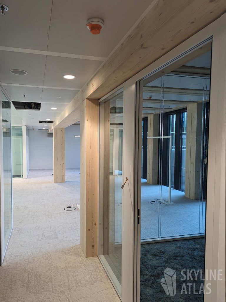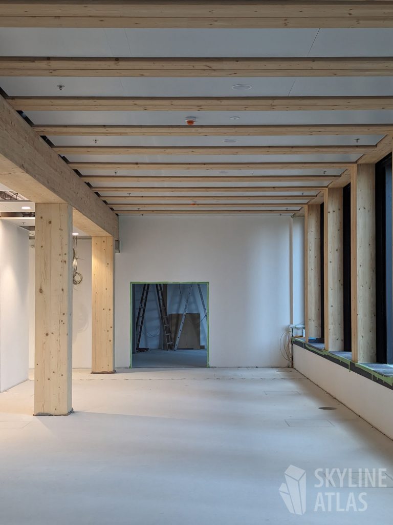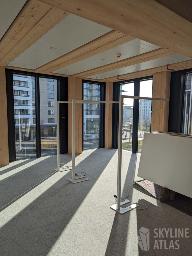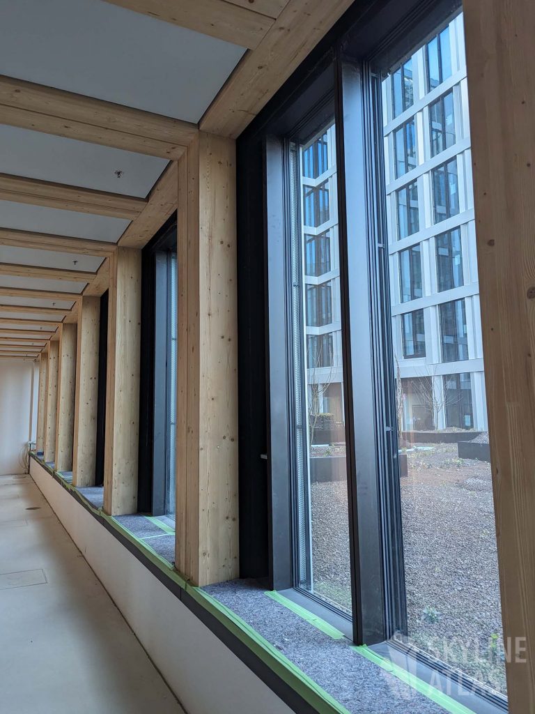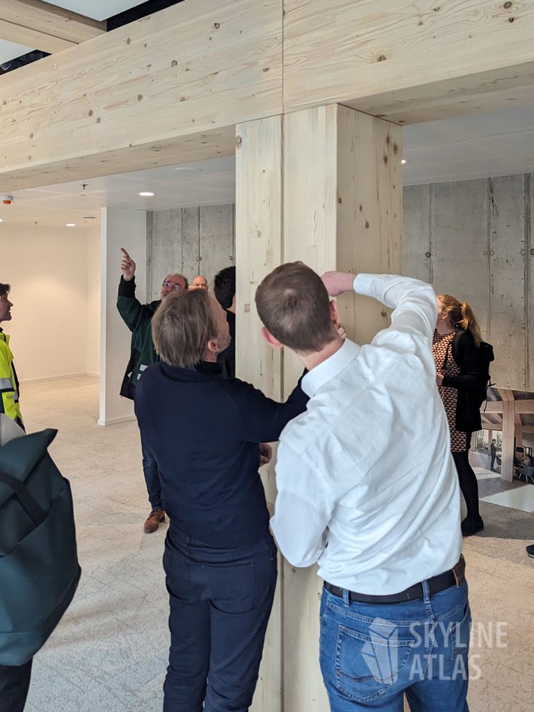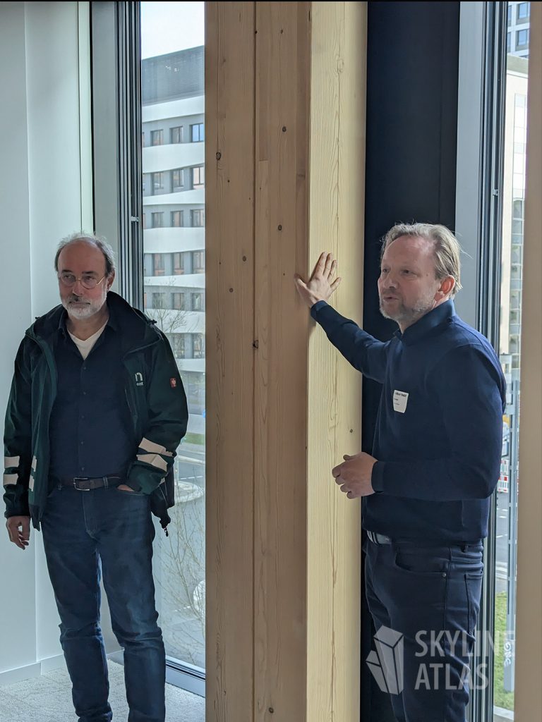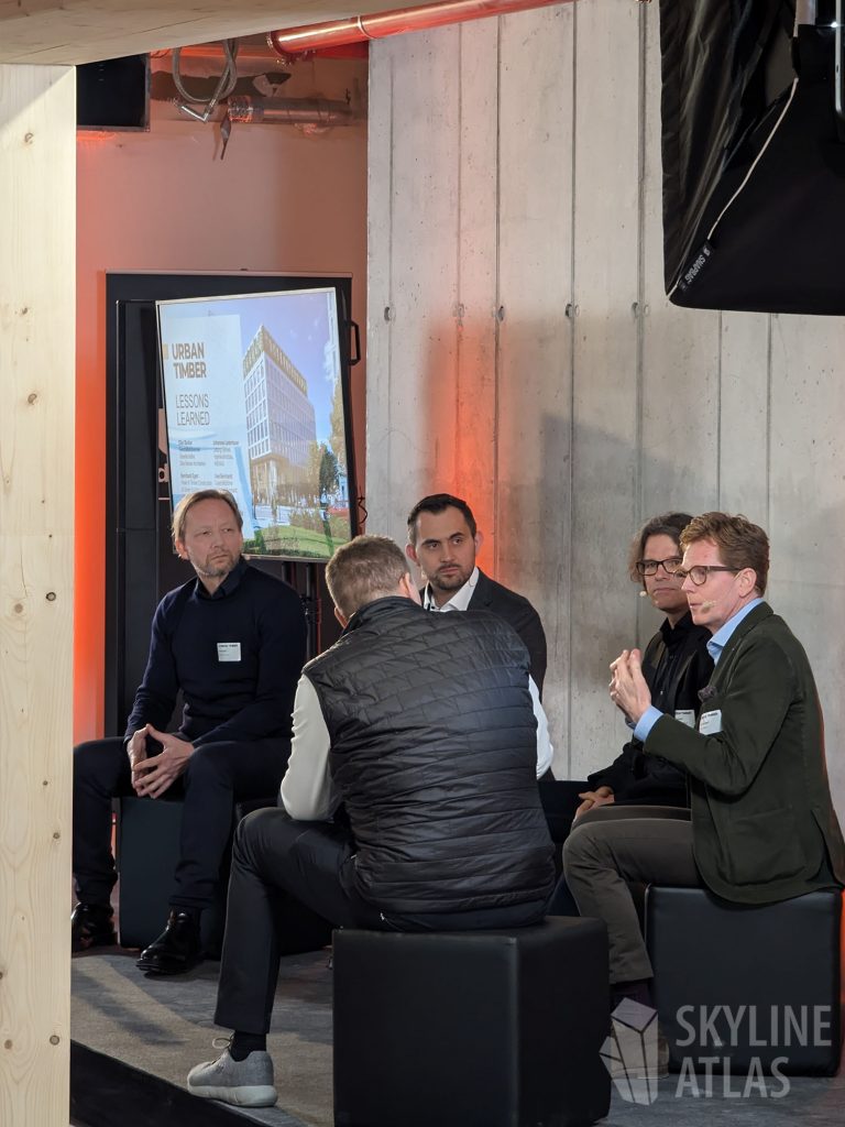 Neben zwei Panel-Diskussionen zu den Themen „The Making of Timber Pioneer“ und „Bürogebäude in Holz als neue Assetklasse?“ wurde ein Rundgang durch ausgewählte Räume des fast fertiggestellten, achtgeschossigen Holz-Hybrid-Gebäudes durchgeführt.
