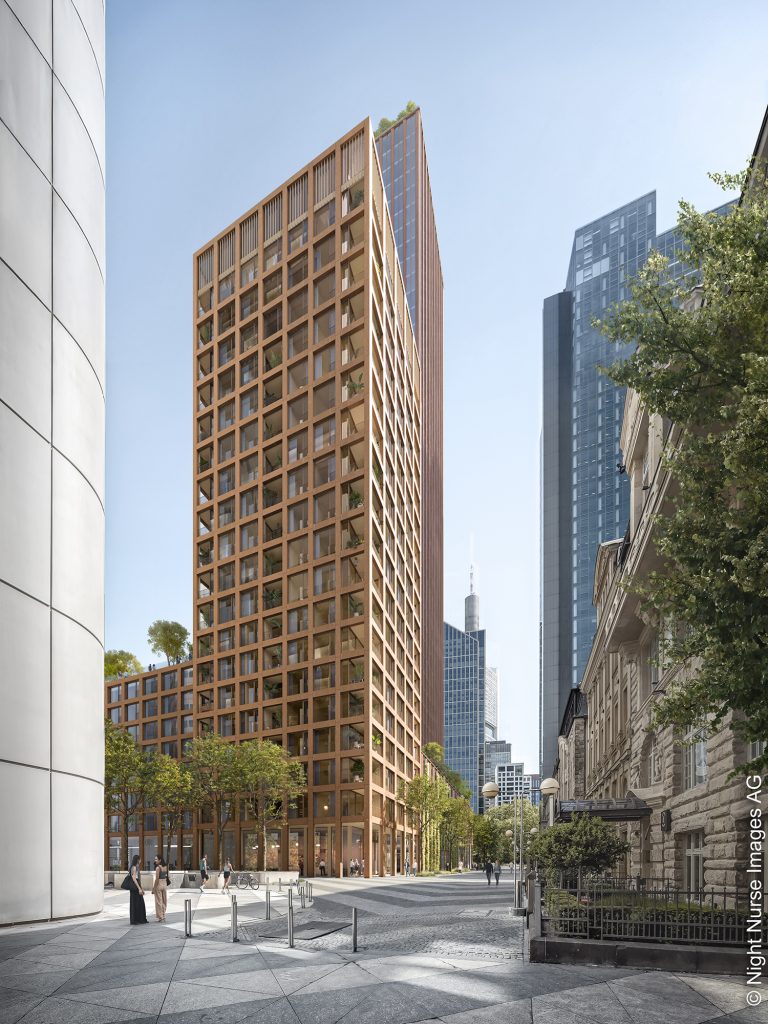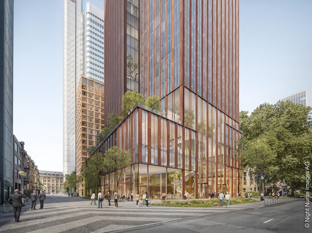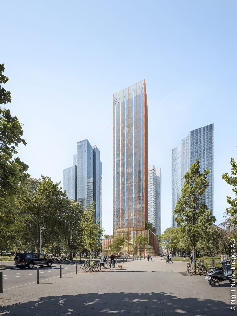 Das Frankfurter Architekturbüro Ferdinand Heide Architekten konnte sich im Rahmen eines Architekturwettbewerbs mit seinem Entwurf für den Wolkenkratzer an der Gallusanlage 8 durchsetzen. Dabei lobte die Jury die zeitlose und städtebaulich durchdachte Gestaltung. Besonders überzeugend ist die Einbindung in den städtischen Kontext, die intelligente Sockel- und Nutzungskonzeption sowie Aspekte der Nachhaltigkeit und Funktionalität. Der schlank proportionierte Büroturm, der zusammen mit dem 60 Meter hohen Wohnturm auf einem Sockel steht, ist so positioniert, dass der benachbarte Silberturm weiterhin als prägendes Element der Skyline ablesbar bleibt. Gleichzeitig ergänzt der neue Hochpunkt das bestehende Cluster. Der abgestufte Sockel soll den Abstand zu den Neckarvillen beibehalten und sich dennoch an der Gallusanlage in Richtung Wallanlagen öffnen. Hier soll ein vertikaler Canyon, der sich über mehrere Geschosse zieht und als öffentlicher Innenraum funktioniert, realisiert werden. Als urbane Promenade verbindet er Erdgeschoss und Turm und bietet dabei Raum für Kultur-, Veranstaltungs- und Gastronomienutzungen. Damit orientiert sich der bronzefarbene Turm an dem städtischen Ziel, Hochhäuser multifunktional aufzustellen und der Öffentlichkeit zugänglich zu machen.