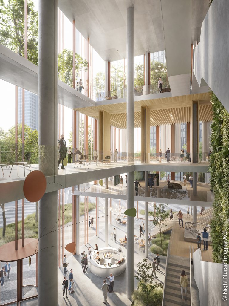Konstruktion und Materialität folgen einem zirkulären sowie langlebigen Konzept: Der Büroturm wird in Stahlbeton ausgeführt, Wohn- und Hotelbereiche als Holz-Hybrid-Konstruktion realisert. Alterungsfähige Fassaden aus Baubronze und Keramik unterstreichen den zeitlosen Charakter des Ensembles in der Skyline. Das Energie- und Technikkonzept setzt auf Photovoltaik, reversible Wärmepumpen sowie Wasser- und Eisspeicher zur Nutzung interner Wärmeströme. Begrünte Dächer, Regenwasserrückhaltung und ressourcenschonende Systeme ergänzen den nachhaltigen Ansatz.