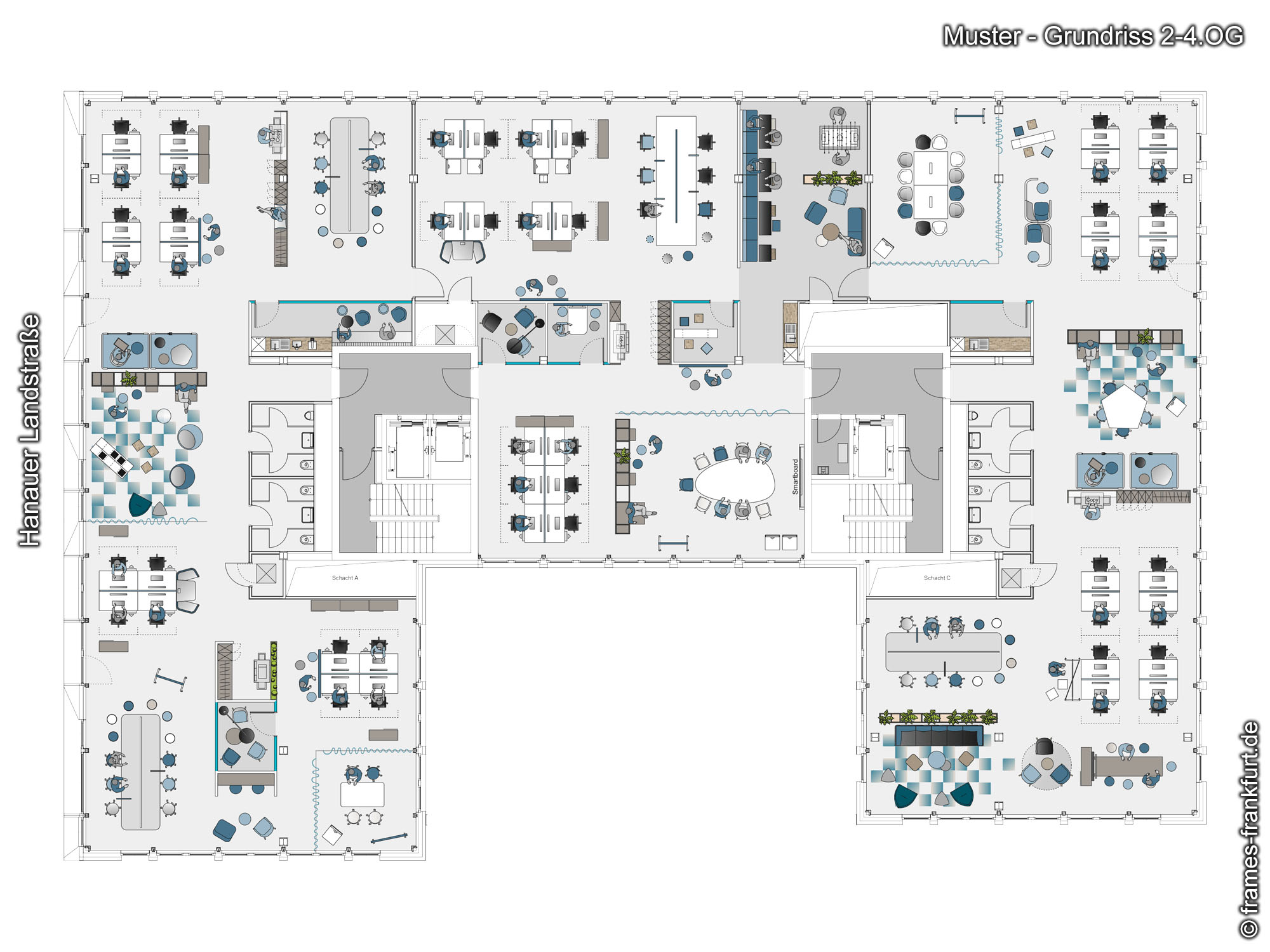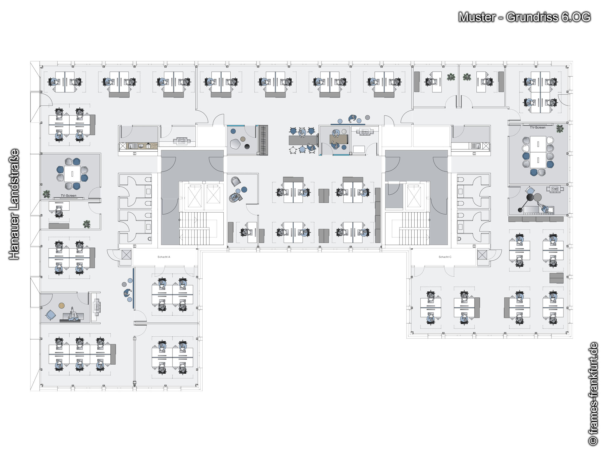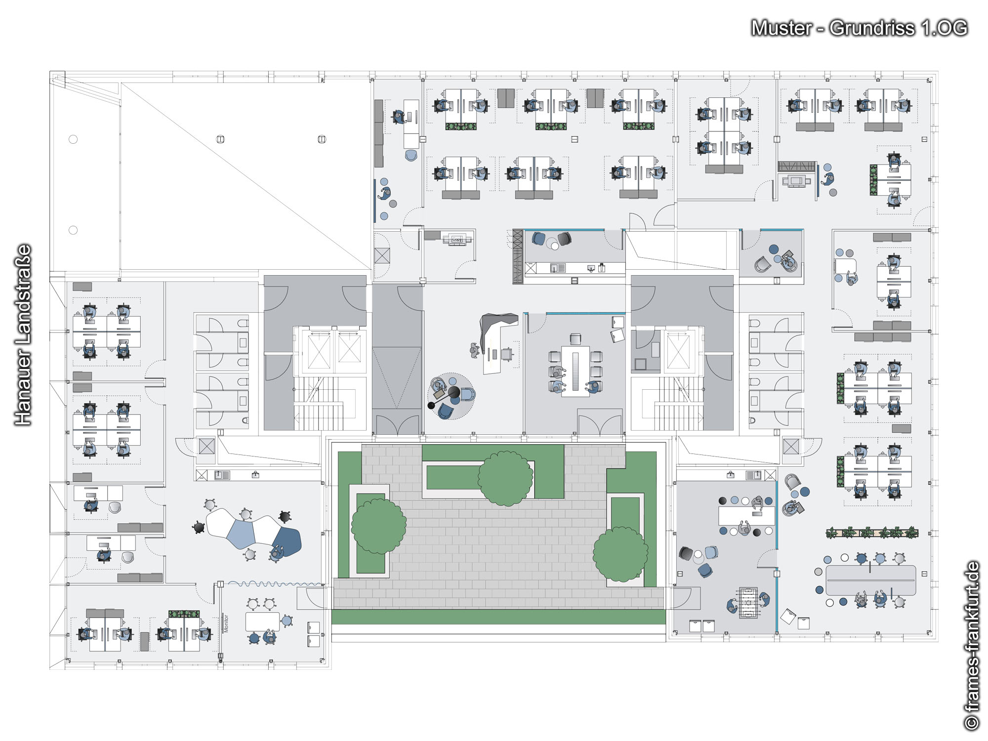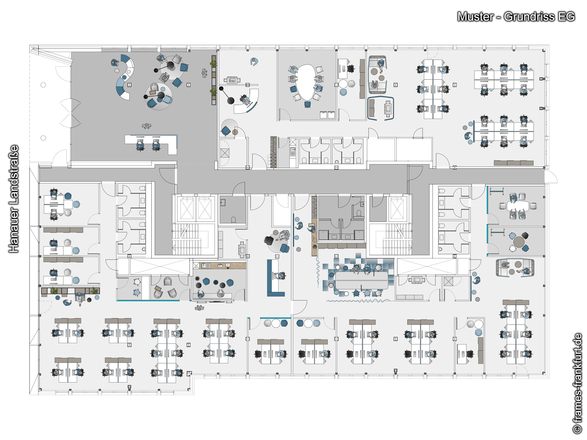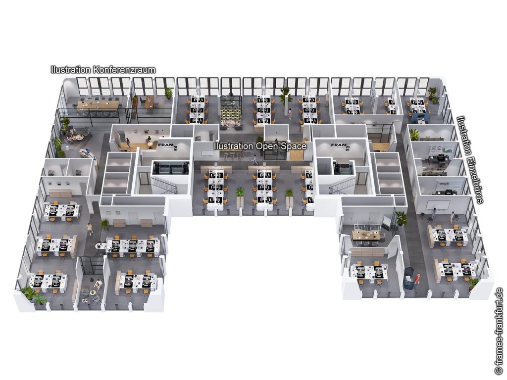 Auf einer Gesamtmietfläche von etwa 7.723 Quadratmetern, verteilt auf sieben Geschosse, bietet das FRAMES Frankfurt flexible Raumkonzepte. Die Büroflächen sind ab ca. 261 Quadratmetern teilbar und ermöglichen individuelle Gestaltungen, sei es als Einzel-, Gruppen- oder Open-Space-Büros. Die Raumhöhe beträgt ca. 2,90 Meter, und bodentiefe, öffenbare Fenster sorgen für helle Arbeitsbereiche. Ein Energieboden mit integrierter Kühl- und Heizfunktion sowie mechanische Lüftungssysteme gewährleisten ein angenehmes Raumklima.