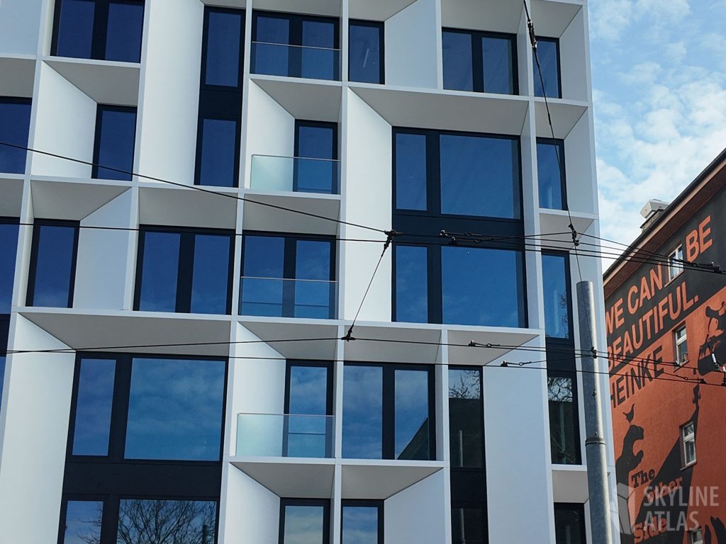 Die markante Fassade des Gebäudes besteht aus unterschiedlich großen, hellen Fassadenelementen – den sogenannten „Frames“ –, die durch tiefe und schräge Laibungen ein dynamisches Erscheinungsbild erzeugen. Im Kontrast dazu stehen die seitlichen Fassaden mit ihrer vertikalen Loch-Band-Gestaltung. Der Zugang erfolgt über eine zweigeschossige Lobby, die einen repräsentativen Empfang bietet.