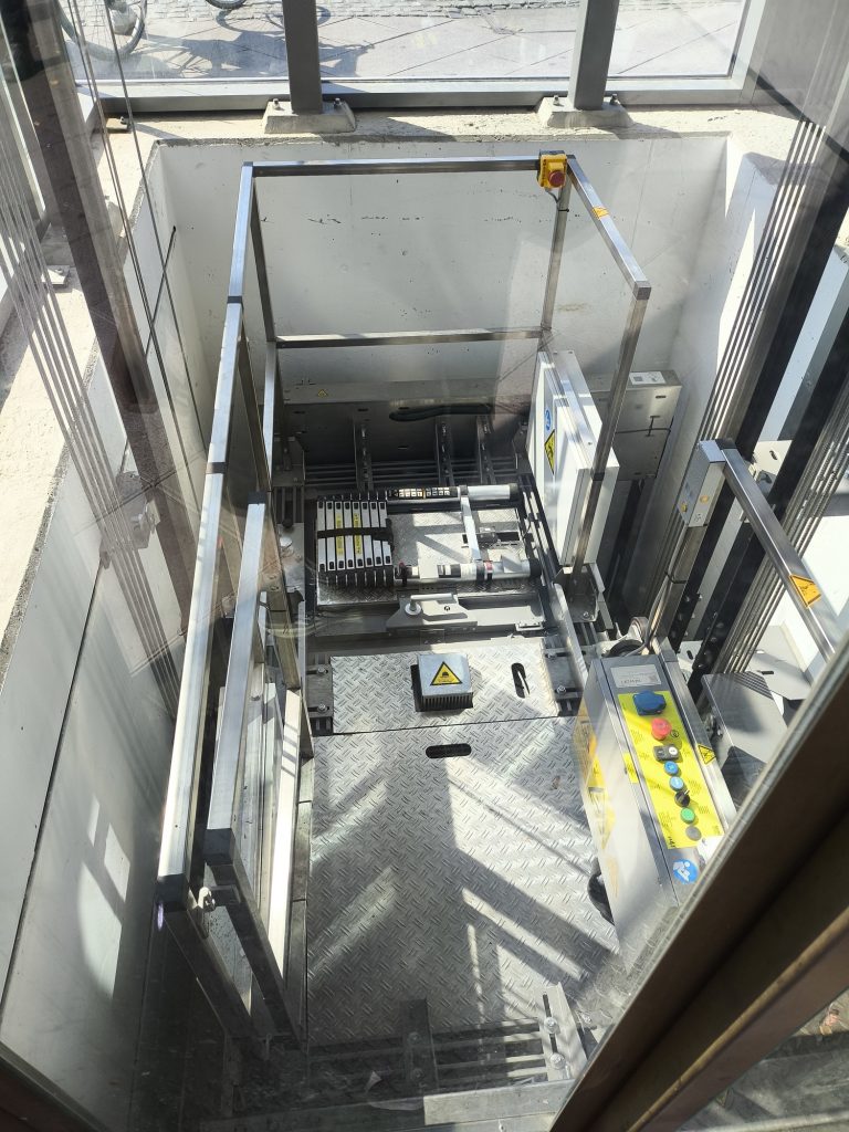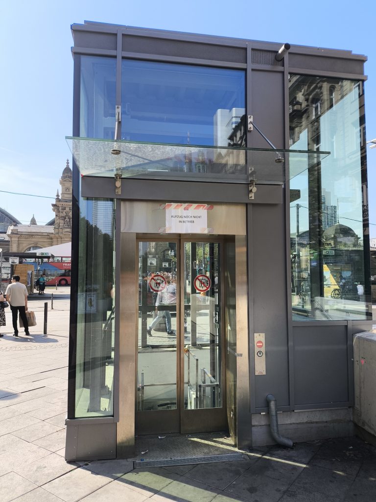 Nach den Vorgaben des Kunden bzw. Architekten wird in der B – Ebene eine sehr anspruchsvolle Glasfassade geplant und umgesetzt, welche bis an die Aufzugsverkleidung heranreicht. Der neue Aufzug an der Kaiserstraße mit einem Mundhaus aus Glas ist modern gestaltet und fügt sich somit gut in das Umfeld der Altbauten am Kaisertor ein. Alle Aufzüge sind so ausgelegt, dass sie die sogenannte EN 81-70 erfüllen. Diese Norm regelt die Zugänglichkeit von Aufzügen für Personen einschließlich Personen mit Beeinträchtigung.