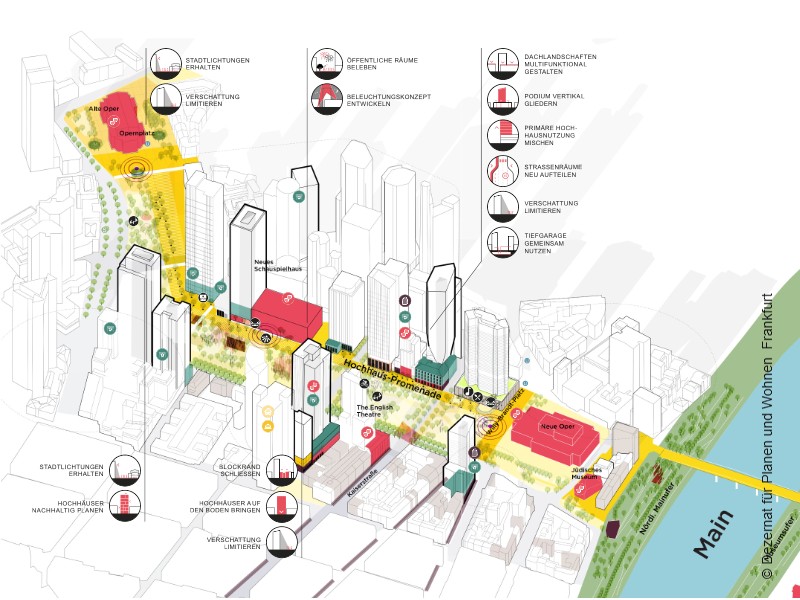 Der Hochhausentwicklungsplan 2024 markiert einen Wandel in der Frankfurter Hochhauspolitik: Im Fokus steht das Miteinander von Hochhäusern bzw. Wolkenkratzern und ihrer Nachbarschaft. Hochhäuser sollen künftig städtebaulichen, sozialen und ökologischen Mehrwert schaffen. Dies soll unter anderem durch gemischte Nutzungen, öffentliche Erdgeschosse und stärkere Quartiersbezüge sichergestellt werden. Zentrale Projekte sind eine Hochhauspromenade entlang der Wallanlagen zwischen Schauspielhaus und Alter Oper sowie neue Cluster im Messeviertel und im Ostend. Ziel ist eine lebendige, dichte und offene Stadtstruktur, in der Hochhäuser das urbane Leben bereichern. Erstmals definiert der Plan verbindliche Qualitäts- und Beteiligungsstandards von der Idee bis zur Umsetzung und unterstützt so die Erreichung der Klimaziele. Gemeinsam mit AS+P entwickelt, steht der neue Hochhausentwicklungsplan für eine nachhaltige, interdisziplinäre und verantwortungsvolle Stadtentwicklung, in der Hochhäuser Teil eines zukunftsfähigen Stadtgefüges sind.