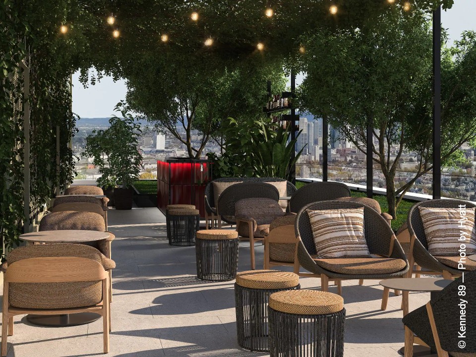 Das Kennedy 89 umfasst 180 Zimmer und 69 Suiten in 20 Kategorien, alle mit Küchen ausgestattet und größtenteils mit Balkonen versehen. Das Konzept richtet sich besonders an Gäste mit längeren Aufenthalten. Neben dem Restaurant „Eighty Nine“ mit levantinischer Küche und einer Terrasse verfügt das Hotel über mehrere Bars, darunter ab Sommer 2026 die Rooftop-Bar Jack’s mit Blick über die Frankfurter Skyline. Ergänzend stehen ein Fitnessstudio, eine Tiefgarage und flexibel kombinierbare Tagungsräume für Business- und Privatevents bereit. Für die Innenarchitektur zeichnet Studio Lux Berlin verantwortlich. Das Design greift den Stil der 1960er-Jahre auf und verweist thematisch auf den Besuch von John F. Kennedy in Frankfurt im Jahr 1963.
