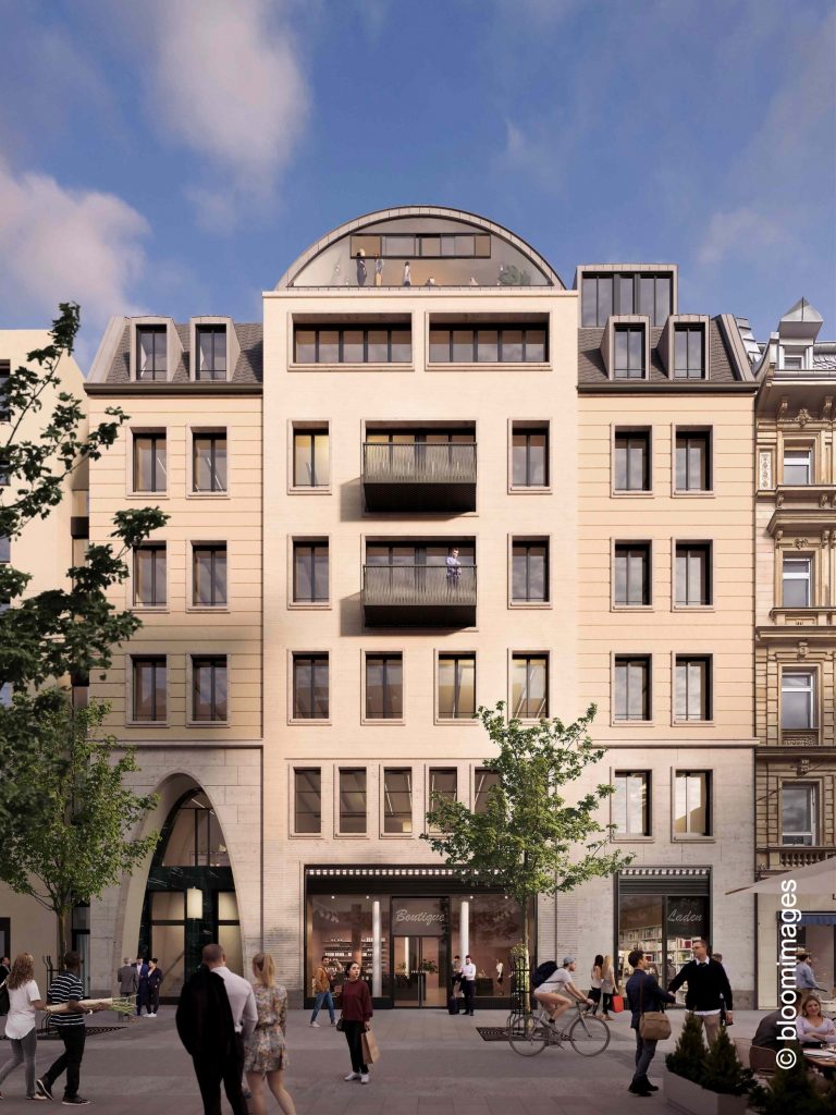 Die denkmalgeschützte Fassade an der Großen Eschenheimer Landstraße bleibt erhalten und das Gebäude wird um zwei Vollgeschosse und ein Staffelgeschoss aufgestockt. Hingegen wird die Fassade an der Schillerstraße durch hellen Naturstein geprägt und das Gebäude erhält zu dieser Straßenseite gut sichtbar ein Kuppeldach, Balkone und Mansarden.