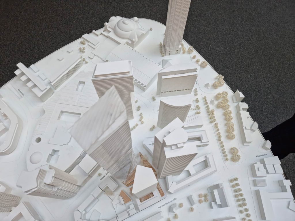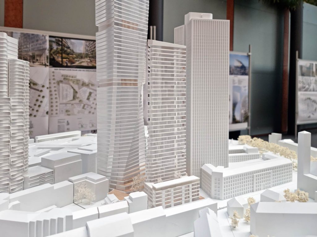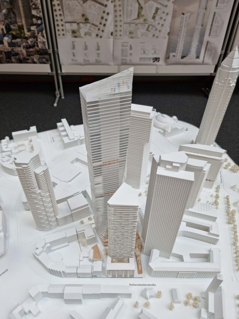 Prof. Johann Eisele, Vorsitzender des Preisgerichts: „Der Entwurf von Ferdinand Heide für das Hochhausensemble überzeugte die Jury durch die gelungene städtebauliche Disposition der Baukörper, welche auch einen Bezug zum bestehenden Tower 185 herstellen. Der Entwurf weist eine gelungene Hierarchie der öffentlichen Räume und eine schlüssige Adressbildung für die verschiedenen Gebäudeteile und Nutzungen auf. Zudem verfügt er über eine spektakuläre Architektur: Das höchste Gebäude ist als in sich verdrehte Skulptur gestaltet. Der obere Abschluss dieses Turms ist prägnant ausformuliert und verleiht dem Gebäude eine markante, unverwechselbare Fernwirkung.“