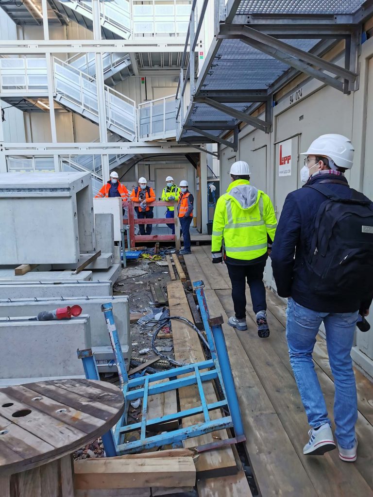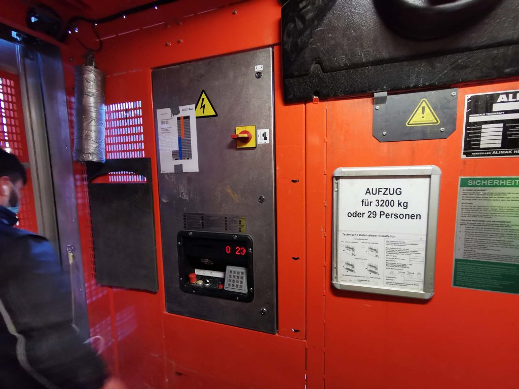 Die Teilnehmer der Baustellenbegehung gingen schließlich zum Bauaufzug. Wie bei jeder Hochhausbaustelle üblich, transportiert der Bauaufzug Menschen, Maschinen und Material. Dabei ging es so hoch, wie derzeit nur möglich: in das 23. Obergeschoss.