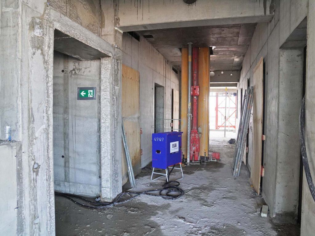 Die Besuchergruppe ließ sich dann die Arbeiten im 24. Obergeschoss zeigen, bei dem sogar noch die Betonarbeiten in vollem Gange waren. „Wir benötigen rund zwei Wochen für eine Etage“, erläuterte der Baumanager. Ein Blick in die Aufzugsschächte offenbarte, dass die Aufzüge noch nicht installiert waren. Die Aufzüge würden vom Hersteller ThyssenKrupp in den kommenden Monaten eingebaut werden.