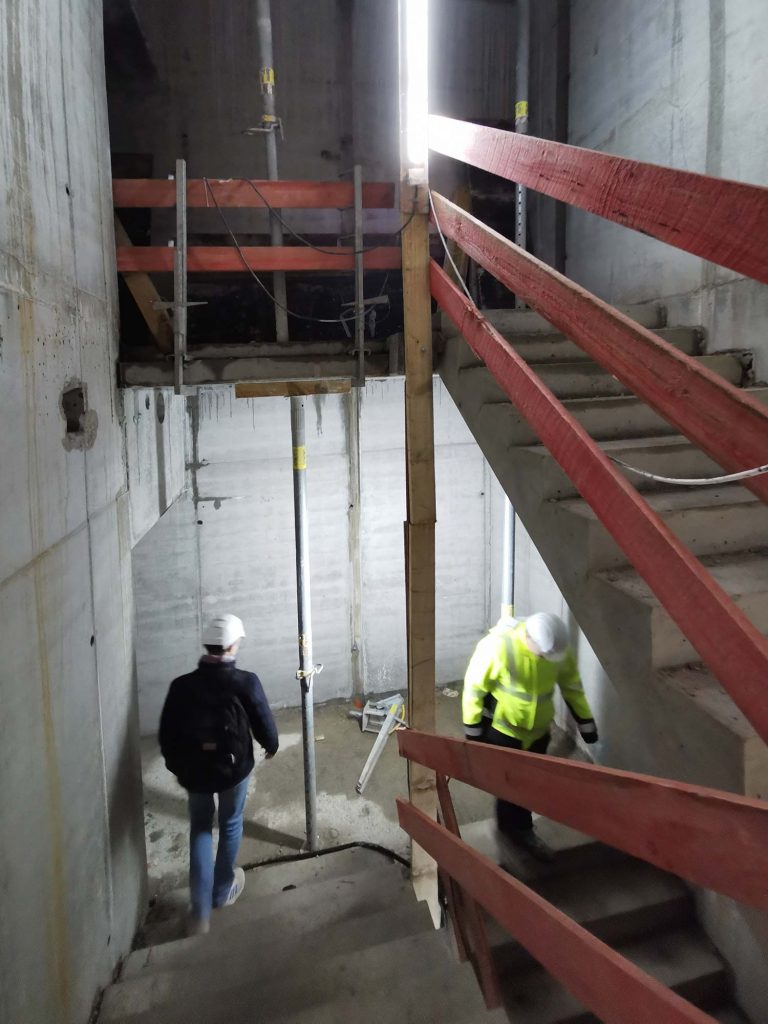 Dann liefen die Teilnehmer vom 24. Stockwerk hinunter in Richtung Erdgeschoss. Bauleiter Ernst erläuterte, dass die Außenhaut des Hochhauses eine Pfosten-Riegel-Fassade erhält. Hierbei würde Wärme, die direkt an der Fassade entsteht, durch Öffnungen direkt abgeleitet werden.