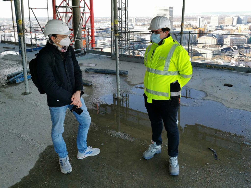 Dieser Donnerstag im Februar 2021 war weder regnerisch noch kalt: Bei schönstem Wetter besuchten Rick Rieck und Michael Wutzke die Baustelle des Senckenberg Turms, der sich derzeit im Bau befindet und fast seine volle Höhe erreicht hat.