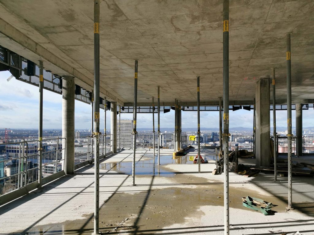 Nach der rund zweiminütigen Fahrt konnten die Besucher den Aufzug verlassen und in den Rohbau wechseln. Hier hatte man einen guten Überblick über den Stand der Bauarbeiten: Während an der unteren Hälfte des Turms bereits die Fassade montiert wurde, war es hier oben luftiger und alles noch offen. Man hörte die Bauarbeiten direkt über dem darüber liegenden Geschoss.