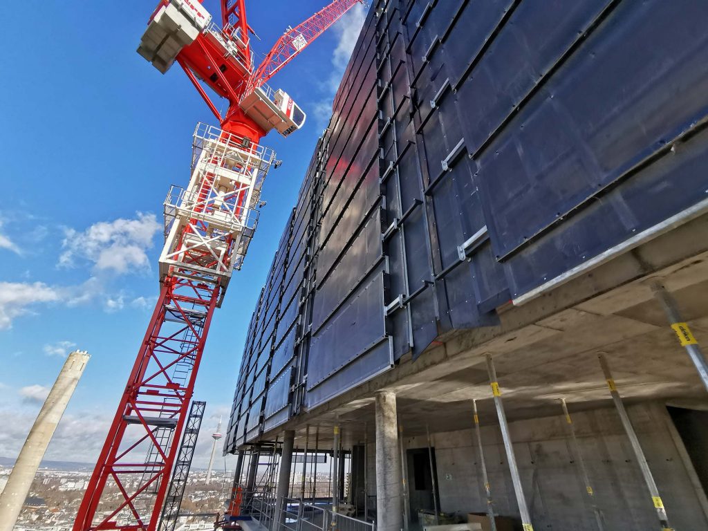 Stephan Ernst ist beim Baumanagement-Unternehmen Drees & Sommer der zuständige Bauleiter für das Hochhausprojekt. Herr Ernst erklärte dann auch die Fakten und den Stand der Dinge: Man liege punktgenau im Zeitplan und derzeit würden die beiden letzten Stockwerke des später insgesamt 26-geschossigen Bürohochhauses entstehen. In circa drei bis vier Wochen seien der Rohbau und Stahlbau schließlich fertig.