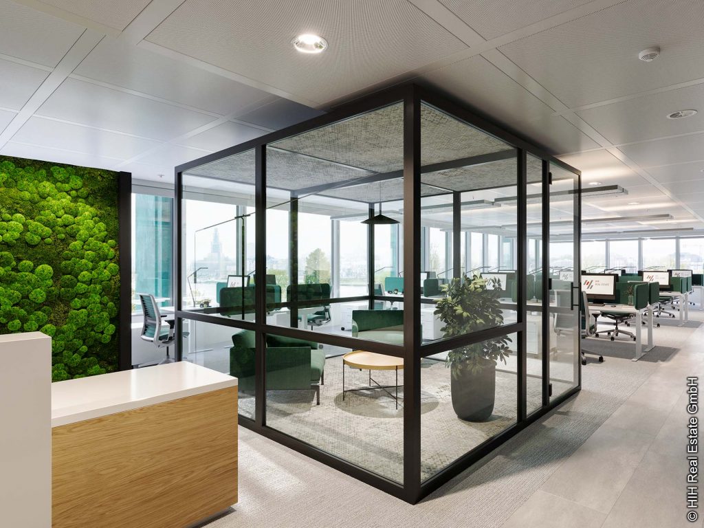 Zur Ausstattung des Hochhauses gehören Kühldecken in den Büroräumen und mechanische Be- und Entlüftung sowie motorbetriebene, öffenbare Fenster. Außerdem besitzen die Stockwerke Doppelböden mit Bodentanks für die Strom- und Netzwerkverkabelung. Die Büroräume mit einer Deckenhöhe von 2,70 Meter sind mit hochwertigen stuhlrollengeeigneten Textilbodenbelag und abgehängten Decken versehen. Die Beleuchtung erfolgt über Pendelleuchten und Stehlampen.