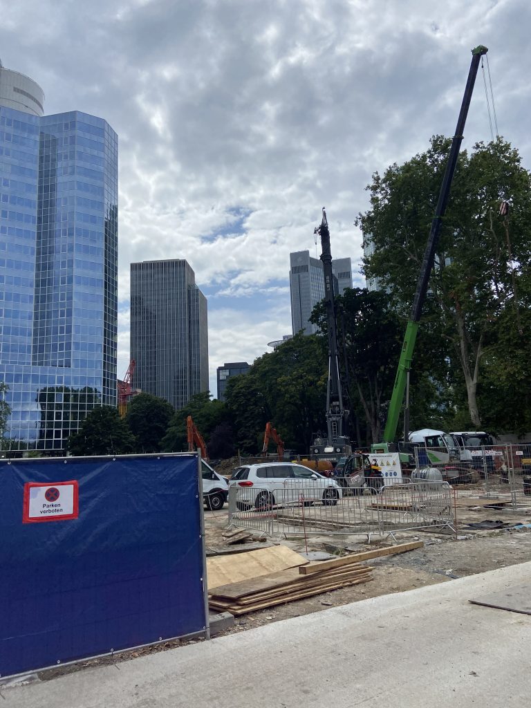 Jetzt rollen die Bagger – auf dem Areal sind zahlreiche Logos des Schweizer Bau- und Immobiliendienstleisters Implenia zu erkennen. Jedoch weiß niemand, was hier, am schönsten Platz Frankfurts, genau entsteht. Oder wissen Sie mehr? Dann schreiben Sie uns gern per Mail an info@skylineatlas.de – und wir werden berichten.