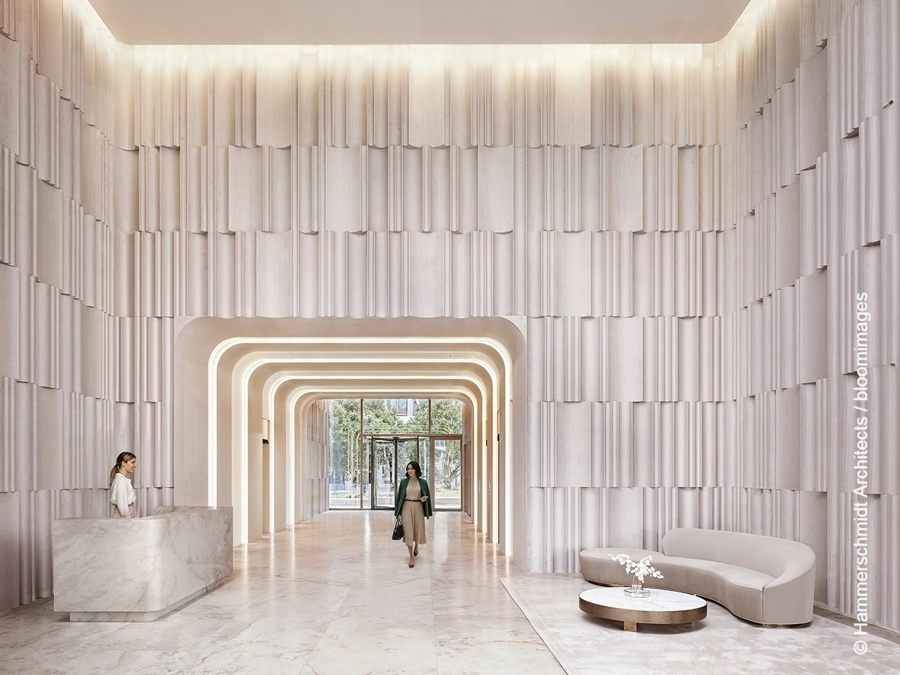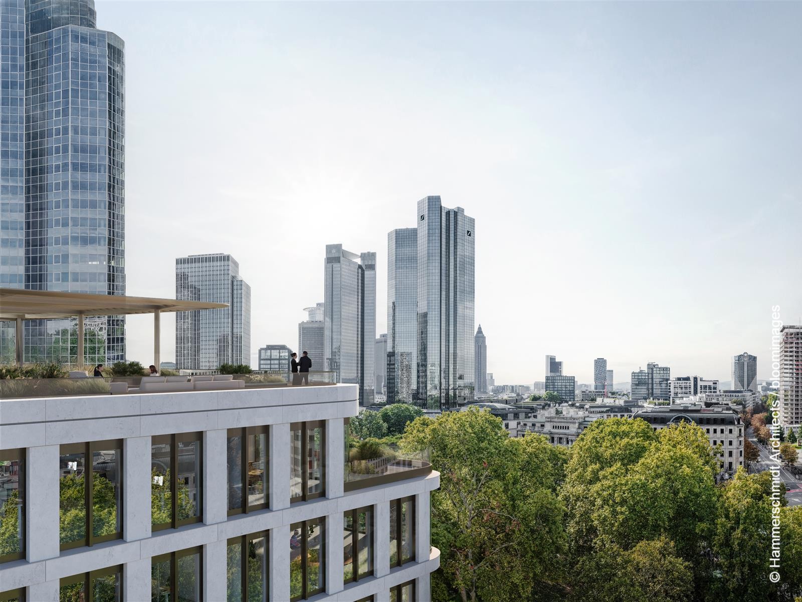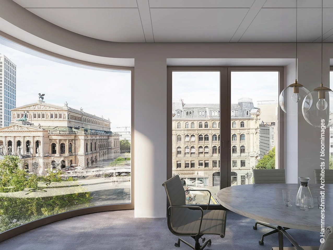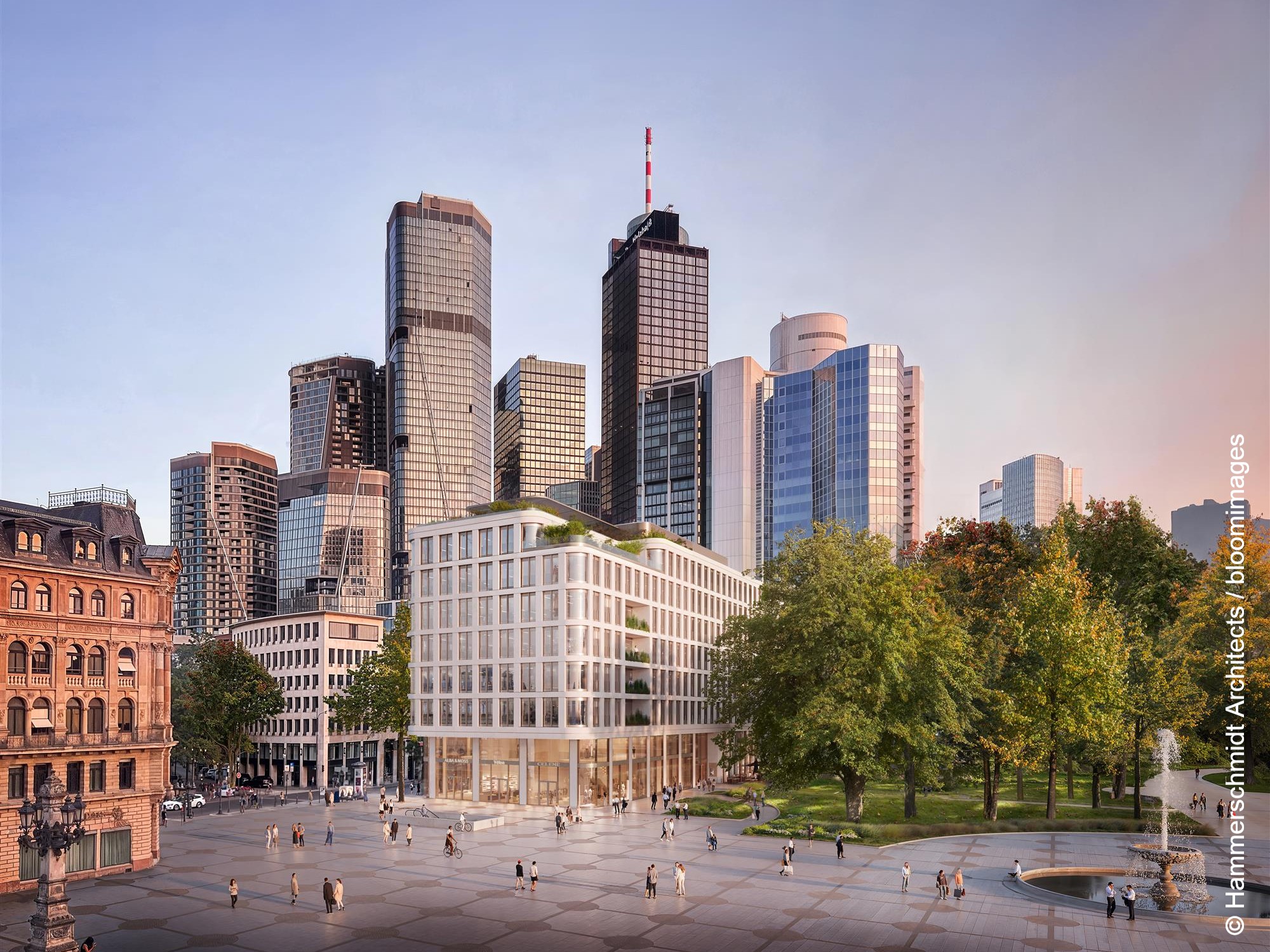 Der Entwurf stammt von Hammerschmidt Architects, die sich bereits im Herbst 2024 in einem städtischen Gutachterverfahren durchsetzen konnten. Gebaut wird ein achtgeschossiges Büro- und Geschäftshaus. Städtebaulich schließt das Gebäude eine Lücke entlang der Neuen Mainzer Straße und gegenüber der Alten Oper. Die abgerundeten Gebäudeecken orientieren sich an der Formensprache der umliegenden Bebauung – darunter die Alte Oper selbst sowie die Gebäude in Richtung Fressgass und Bockenheimer Landstraße.