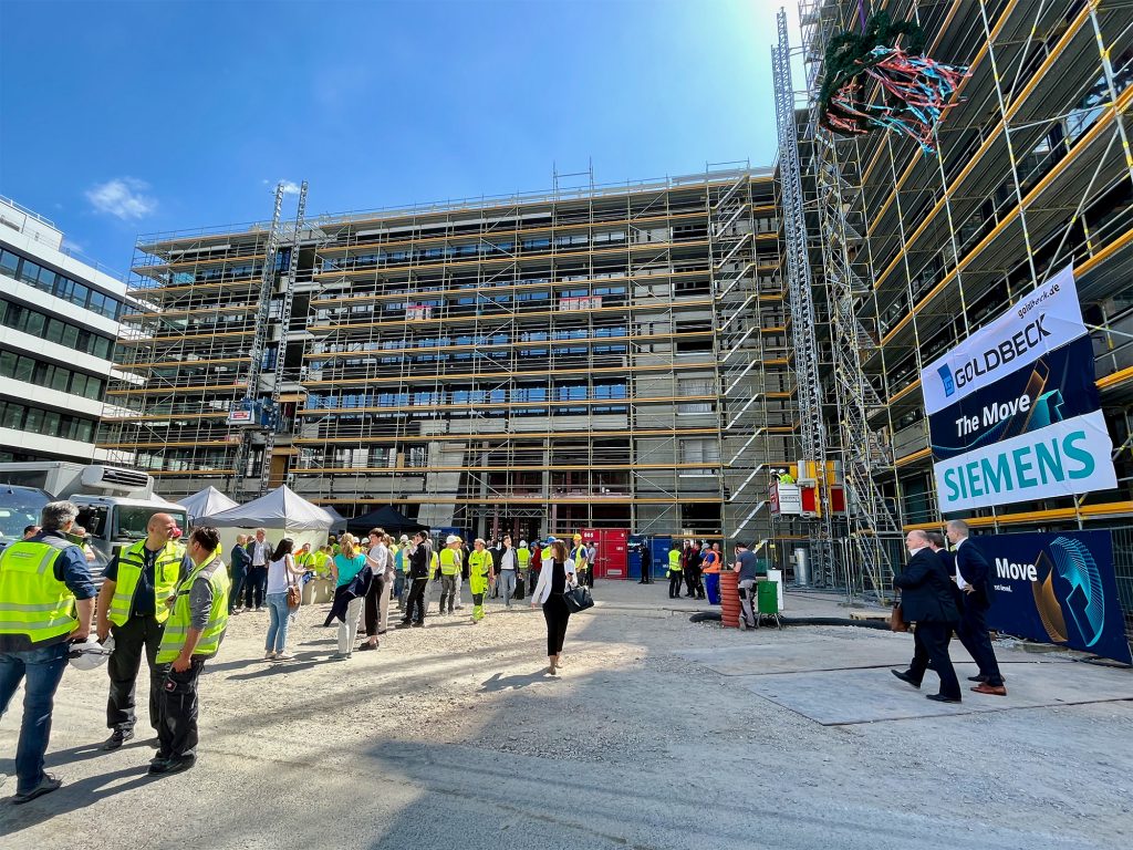 Das neue Büroensemble „The Move“ im Frankfurter Entwicklungsgebiet Gateway Gardens hat einen wichtigen Meilenstein erreicht. Knapp ein Jahr nach der Grundsteinlegung feierte Bauherr Siemens Real Estate (SRE) mit rund 400 Baubeteiligten und geladenen Gästen das Richtfest für den innovativen Neubau. Siemens errichtet hier gemeinsam mit dem Bauherren Goldbeck Deutschland GmbH zwei Gebäude mit rund 35.000 Quadratmeter Bürofläche nach einem neuartigen Arbeitsplatzkonzept, das gezielt auf den Ansatz neuester New Work Formate ausgerichtet ist. Das Neubauensemble umfasst die zwei Gebäude The Move Orange und The Move Blue, wobei auch rund 20.000 Quadratmeter Bürofläche externen Mietern zur Verfügung stehen.
