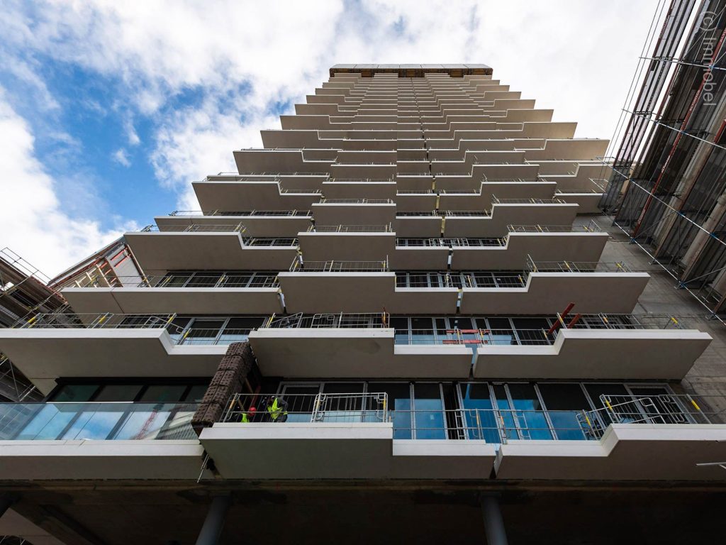 Die Rohbauarbeiten mit dem Gießen des letzten Betons im oberen Geschoss werden nun abgeschlossen. Die Anbringung der Fassade und der Innenausbau erfolgen mittlerweile seit rund zwei Monaten. Im nächsten Schritt werden unter anderem die Apartments im gesamten Hochhaus mit einer Fußbodenheizung ausgestattet. Sie ist so angelegt, dass sie im Sommer kühlt und im Winter wärmt. In den kommenden Wochen soll dann bereits eine Musterwohnung fertiggestellt sein und das Begrünungskonzept Interessenten vorgestellt werden.