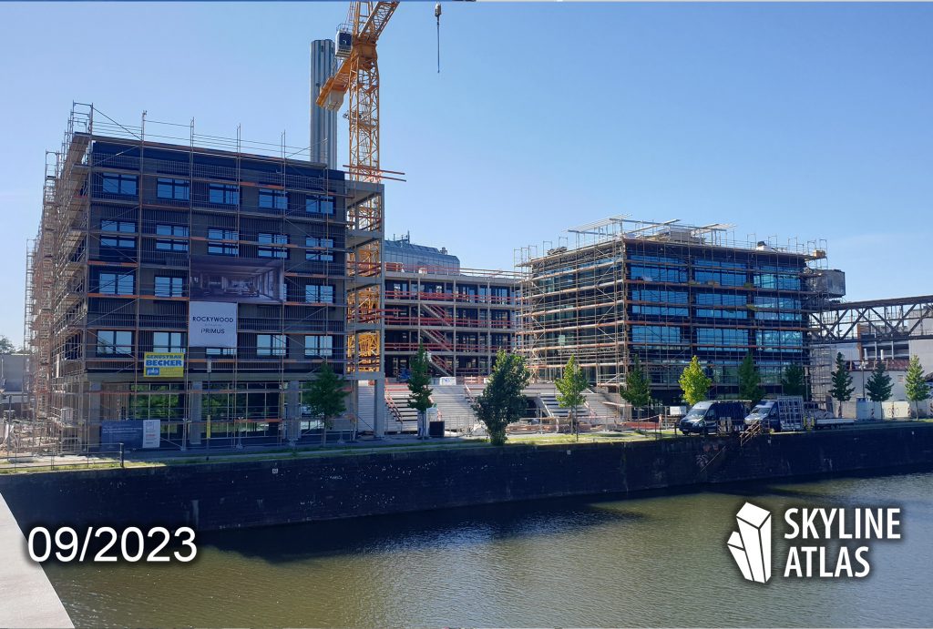 Mit ROCKYWOOD entwickelt der Projektentwickler Primus Developements an der Hafenpromenade in Offenbach am Main ein Mikroquartier, in dessen Mitte ein Playground, ein erhöhter öffentlicher Platz entsteht. Der Entwurf stammt von Eike Becker Architekten. Es handelt sich dabei um zwei Gebäude: Das Erste trägt den Namen Rocky und ist als freigestellter Solitär an der Hafenpromenade konzipiert, wobei die stützenfreien Loftbüros einen freien Blick auf den Main und die Skyline von Frankfurt ermöglichen. Wood heißt das zweite Gebäude und ist ein Holzmodulbau auf einem massiven Sockel.