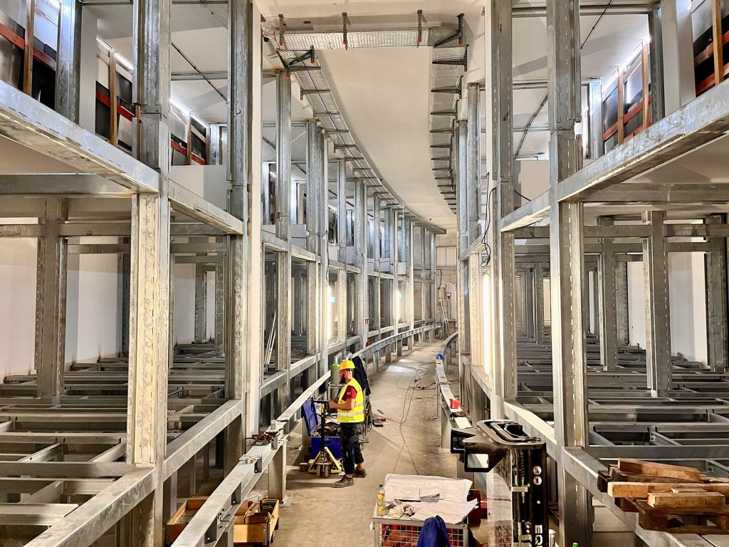 Wenn die technische Gebäudeausrüstung im Bereich des Ringbeschleunigers abgeschlossen sein wird, kann mit dem Einbau der Beschleuniger-Maschine begonnen werden. Der Ringbeschleuniger befindet sich ausschließlich unter der Erde in ca. 15 Meter Tiefe und kann über mehrere Eingänge betreten werden. Beeindruckend ist die Größe des Tunnelbaus, obwohl das Rohr mit den beschleunigten Teilchen am Ende nur einen Durchmesser von ein paar Zentimetern haben wird. Neben dem eigentlichen Beschleunigertunnel liegt ein Versorgungstunnel, in dem unter anderem Leitungen für Strom und flüssiges Helium, Platz für Netzgeräte und Möglichkeiten zur Kontrolle der Ionenstrahlqualität untergebracht sind. Das flüssige Helium werde zur Kühlung der Magneten gebraucht, die die Ionen auf ihrer Bahn halten würden, erklärt Nils Walldorf.