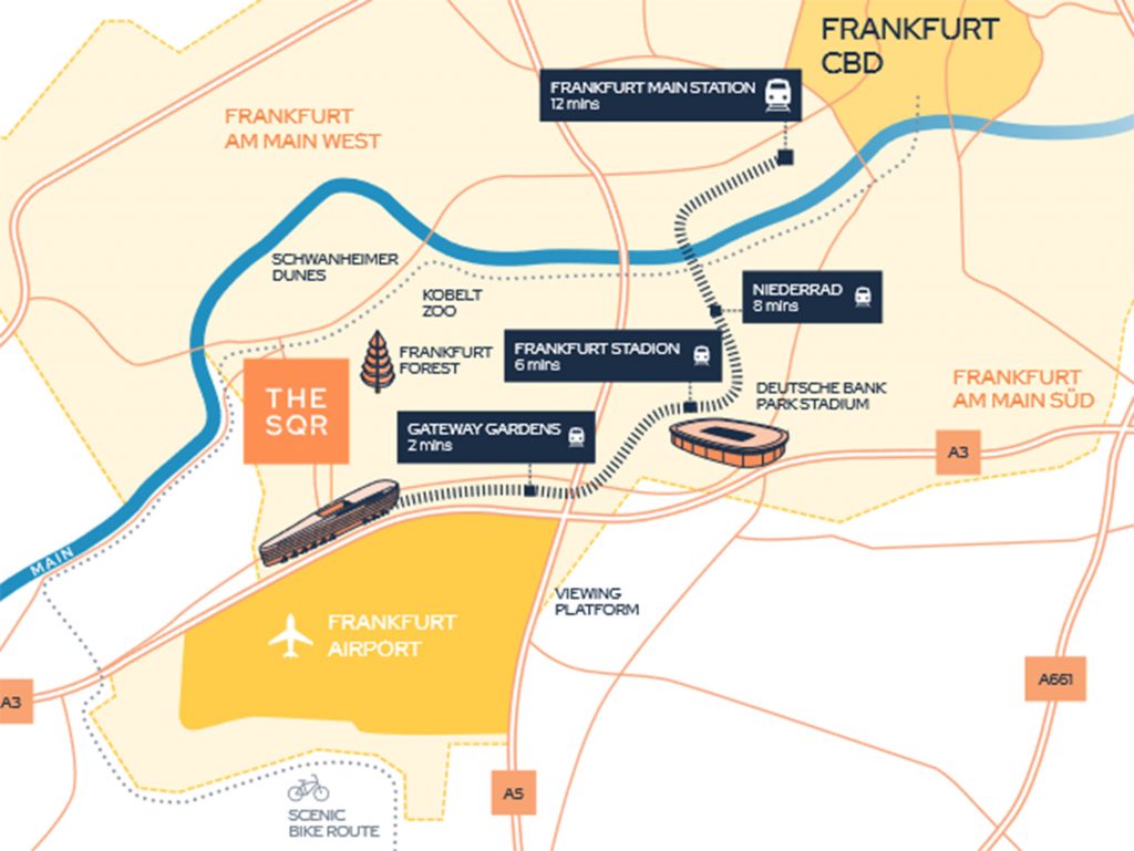 Das SQUAIRE ist nicht nur Deutschlands größtes, sondern zudem das am besten angebunde Bürogebäude. Als Frankfurts einziges Hub-Gebäude verfügt es über das Prestige und die Präsenz eines innerstädtischen Bürogebäudes, allerdings ohne innerstädtische Verkehrsstaus und Parkplatzprobleme. Durch seine erstklassige Lage, besticht es nicht nur durch seinen Komfort, sondern durch eine einzigartige Konnektvität: