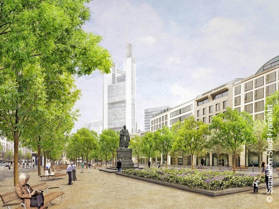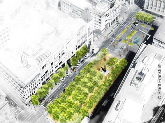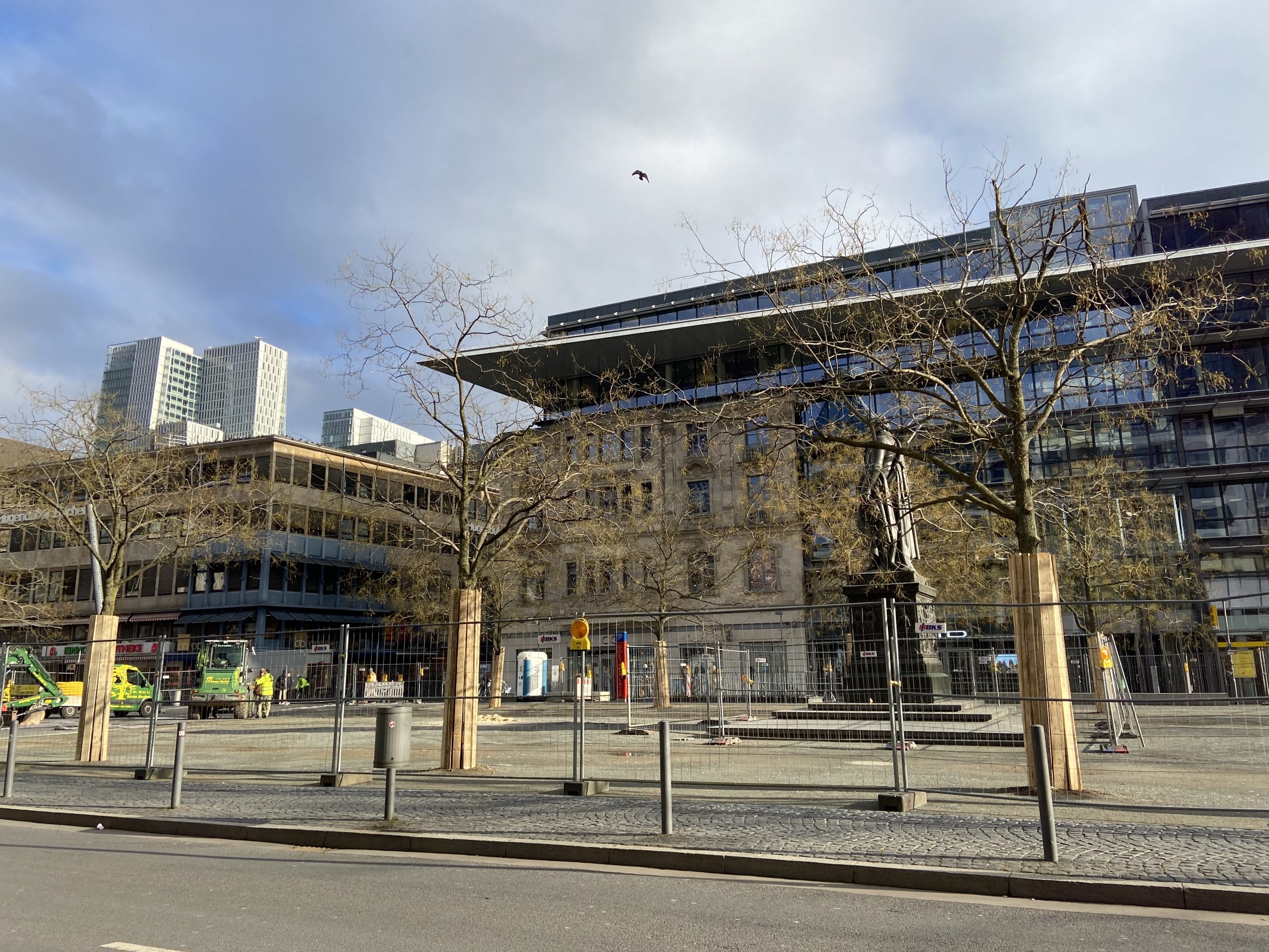 Goetheplatz soll bis Sommer schöner und grüner werden Posted on 16. Januar 202521. Januar 2025 Redaktion Die Platzfolge Rathenauplatz-Goetheplatz-Roßmarkt ist vor dem Hintergrund von Klimawandel und veränderten Nutzungsansprüchen an städtische Plätze nicht mehr zeitgemäß. Schritt für Schritt sollen die drei Plätze in der Innenstadt nun endlich weiterentwickelt werden. Gestartet wird mit dem Goetheplatz, wobei diese Arbeiten bis Frühsommer 2025 abgeschlossen sein sollen. Nach und nach sollen dann auch Roßmarkt und Rathenauplatz klimaangepasst weiterentwickelt werden. Das gaben Planungsdezernent Marcus Gwechenberger, Verkehrsdezernent Wolfgang Siefert und Umweltdezernentin Tina Zapf-Rodriguez zum Start der Umbaumaßnahmen bekannt. Im Sommer viel zu heiß, im Winter meistens unbelebt. Darüber sind sich Politik, Verwaltung und Stadtbevölkerung seit langem einig. Bereits 2023 hatten die Stadtverordneten einer vom Planungs- und Umweltdezernat erstellten Vorlage zur Umgestaltung der drei Plätze zugestimmt. Und schon vor rund zehn Jahren gab es erste Beschlüsse der Stadtverordnetenversammlung zur Umgestaltung des Rathenauplatzs, Goetheplatzes und Roßmarkts. Mittlerweile ist die Umgestaltung jedoch nicht mehr nur eine ästhetische Frage. Die vergangenen heißen Sommer haben deutlich gemacht, dass ein Platz, der keinen Schatten hat und damit keine Abkühlung bietet, keine Aufenthaltsqualität hat. In den nächsten Wochen soll auf dem Goetheplatz der bislang dunkle und sich bei Hitze stark aufheizende Bodenbelag durch einen hellen Belag ersetzt werden, der in der Planungsphase bereits getestet und gemeinsam mit politischen Vertreterinnen und Vertretern festgelegt wurde. Außerdem sollen 27 weitere Sitzmöbel, darunter auch Liegen und seniorengerechte Bänke, aufgestellt werden. Zusätzlich zu den bereits vorhandenen 40 Schnurbäumen soll ein Staudenbeet mit trockenheitsresistenten Pflanzen wie Astern, Sonnenhut oder Thymian vor dem Goethedenkmal angelegt werden. Eine sensorgesteuerte Bewässerungsanlage sorgt künftig für eine effiziente und ressourcenschonende Wasserversorgung der Bäume und Pflanzen. „Ein grüner Mittelpunkt im Zentrum der Innenstadt mit Raum für Veranstaltungen. Das ist das Ziel für den Goetheplatz, wie für die gesamte Platzfolge“, sagt Zapf-Rodríguez. „Die Weiterentwicklung war längst überfällig. Ich bin sehr froh, dass wir nun nach und nach unsere Pläne realisieren.“ „Frankfurt ist eine der heißesten Städte Deutschlands“ Insgesamt wird für alle drei Plätze mit Kosten von insgesamt 2,8 Millionen Euro gerechnet. Geplant ist, die entsprechenden Bau- und Finanzierungsvorlagen nach Vorliegen der konkreten Kosten noch in diesem Jahr dem Magistrat zur Abstimmung zu geben. Das Projekt für den Goetheplatz wird mit vorläufigen Gesamtkosten von 750.000 Euro umgesetzt und mit Mitteln aus dem Programm „Schöneres Frankfurt“ unterstützt. Um zu verhindern, dass der Platz im Sommer zu heiß wird, existieren Überlegungen zu einer Dachkonstruktion, die mit Stoffsegeln bespannt oder auch berankt und begrünt werden könnte. Auch für den Roßmarkt könnten in einem zweiten Schritt begrünte Elemente wie Pergolen entstehen. Zudem könnten weitere Cafés und Restaurants mit Außengastronomie in den Erdgeschossen die Aufenthaltsqualität des Platzes erhöhen und ihn zu einem öffentlichen „Wohnzimmer“ Frankfurts machen. Ob und wann auch der von Markus Gwechenberger schon mehrfach angekündigte größte Boule-Platz Frankfurts entstehen soll, blieb unbeantwortet. Keine weiteren neuen Bäume und Entsieglung wegen Tiefgarage möglich „Frankfurt ist schon heute eine der heißesten Städte Deutschlands und der Goetheplatz trotz des kleinen Baumhains aus Schnurbäumen zusammen mit Roßmarkt und Rathenauplatz eine der Hitzeinseln in der Stadt. Wir werden den Goetheplatz an die Herausforderungen des Klimawandels anpassen und damit die Aufenthaltsqualität für unsere Bürger:innen und Gäste deutlich verbessern, so dass sich Menschen insbesondere im Sommer und auch bei großer Hitze gern dort aufhalten“, erklärte Klima- und Umweltdezernentin Tina Zapf-Rodríguez anlässlich des Baubeginns auf dem Goetheplatz. Entsiegelungen und umfassende neue Baumpflanzungen, sprich typische Maßnahmen zur Verbesserung des Stadtklimas, sind aufgrund der Lage des Platzes direkt über einer Tiefgarage und dem U- und S-Bahnnetz nicht umsetzbar, so Mobilitätsdezernent Wolfgang Siefert. „Mit der Weiterentwicklung des Goetheplatzes reagieren wir auf die Wünsche der Frankfurterinnen und Frankfurter nach mehr Grün und Aufenthaltsqualität“, erklärte Marcus Gwechenberger, Dezernent für Planen und Wohnen. „Durch die vielfältigen Sitzmöglichkeiten und die stärkere Begrünung wird der Platz nicht nur einladender, sondern auch ein lebendiges Bindeglied zwischen Rathenauplatz und Roßmarkt. Wir schaffen hier einen Ort, der für Erholung und Begegnung in der Innenstadt steht.“ Die Dreierplatzfolge Rathenauplatz, Goetheplatz, und Roßmarkt wurde im Zuge des Tiefgaragenbaus zwischen 2006 und 2009 neugestaltet. Die aktuelle Maßnahme greift auf die Konzeptstudie „Beblühung“ aus dem Jahr 2013 zurück, ergänzt durch Planungen gemäß den Vereinbarungen der Stadt Frankfurt zur Klimaallianz sowie dem Grundsatzbeschluss „Klimaneutrales Frankfurt 2035“. Grundlage der Planungen sind unter anderem die Maßgaben des im März 2023 von der Stadtverordnetenversammlung beschlossenen Leitfadens zur klimaangepassten Stadtplatzgestaltung. Previous Next
