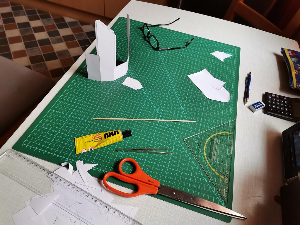 Sind alle Gebäudeteile auf Papier gebracht, werden die Bleistiftzeichnungen kopiert. Das Original verbleibt im Schreibtisch. Später werden die Kopierten Gebäudeteile der Farbe nach mit Buntstift farblich gestaltet. Es wird also kein Computer oder Drucker für das gesamte Projekt eingesetzt. Im nächsten Arbeitsschritt werden alle Teile ausgeschnitten und an den gezeichneten Kanten gefalzt und mit einem Lineal umgelegt. Dadurch ergeben sich sehr scharfe Klebekanten.