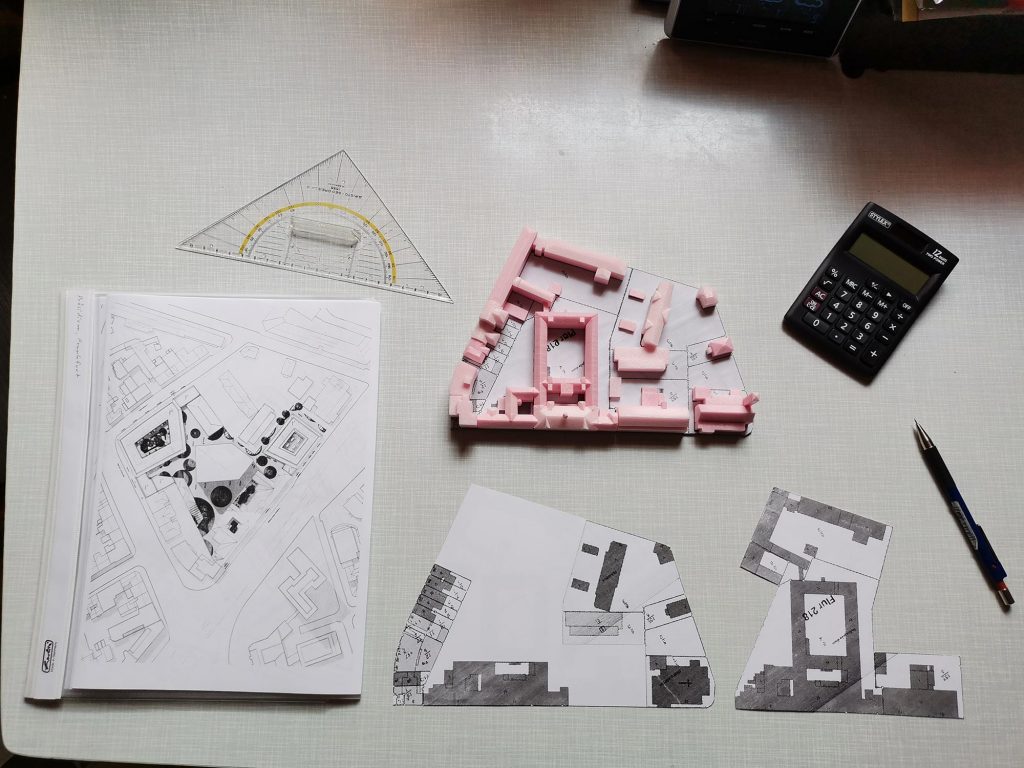 Hierbei war auf genauen Maßstab 1:1000 und die Höhe der Gebäude zu achten. Jetzt ging es an den zeichnerischen Part. Mit Bleistift, Lineal, Papier und Taschenrechner übertrug ich die Maße und die vielen Fenster auf das Zeichenpapier. Auf absolute Maßgenauigkeit war zu achten, denn beim späteren Zusammensetzen der Architektur kann das sonst fatale Folgen haben.