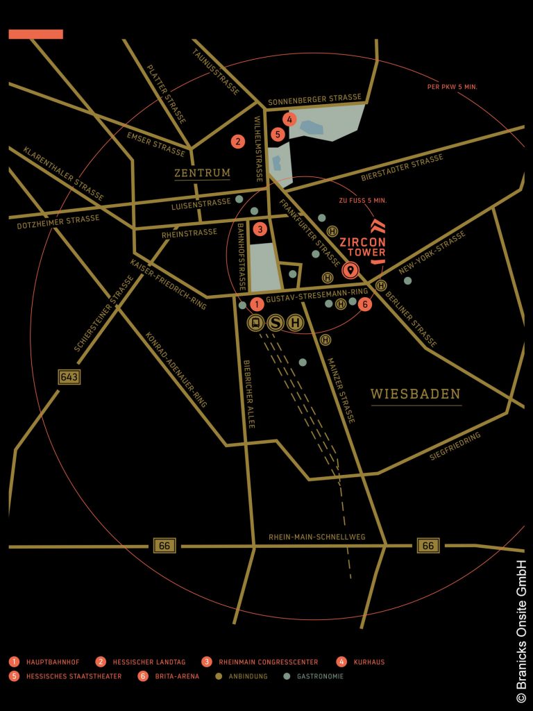 Durch seine zentrale Lage am Gustav-Stresemann-Ring 12-16 erhalten Besucher und Mieter des Zircon Tower schnellen Zugang zu den Wiesbadener Sehenswürdigkeiten wie dem Kurhaus, dem Kurpark, der Wilhelmstraße oder Schloss Biebrich. Dies sorgt dafür, dass das Gebäude sowohl kulturell als auch wirtschaftlich bestens eingebunden ist.